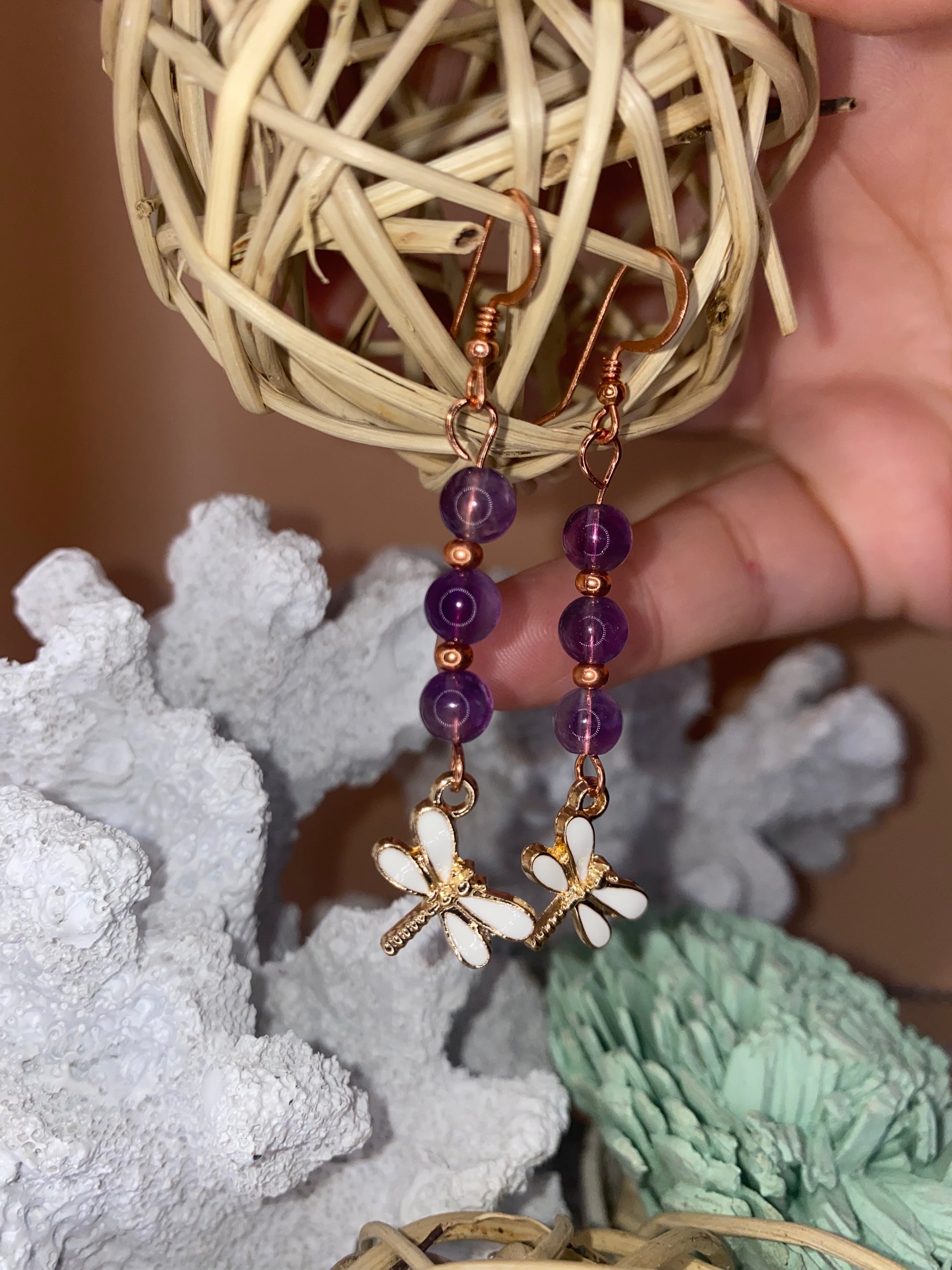Add a touch of whimsy to your jewelry collection with our Amethyst Dragonfly Earrings! These unique earrings feature beautiful Amethyst beads and copper beads, all adorned with a playful dragonfly charm. Stand out from the crowd with these one-of-a-kind earrings!