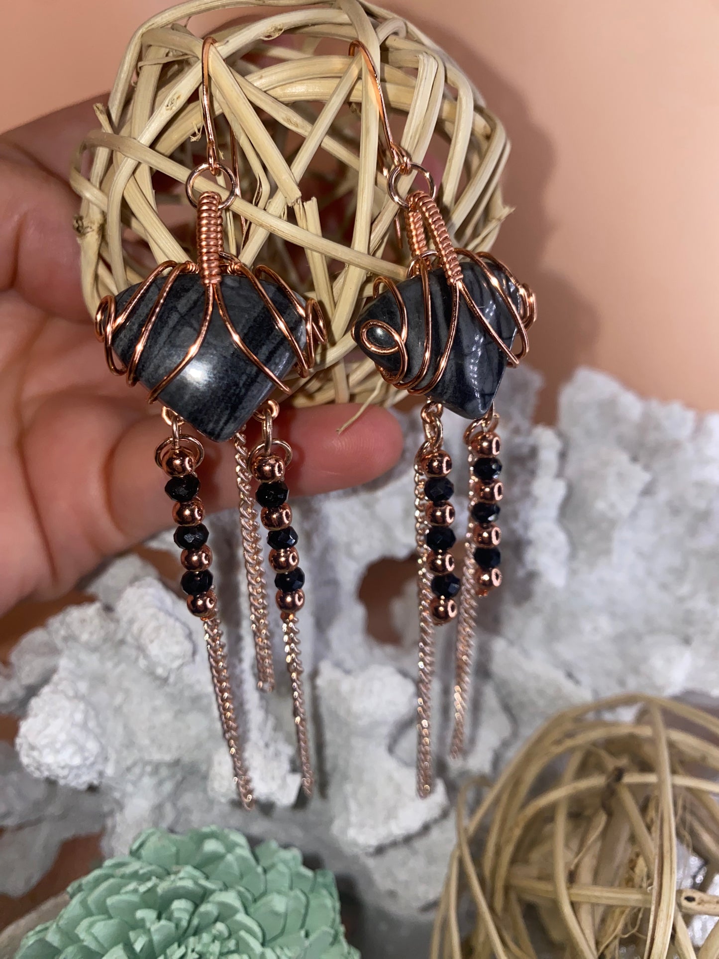 Add a touch of edge to your wardrobe with our Picasso Jasper Rebel Earrings. These unique earrings feature a bold wire-wrapped design, accented with obsidian rose cut beads and dangle chains. Each earring showcases the natural beauty of picasso jasper, making a statement that is both daring and sophisticated. Go ahead, make a statement and take a risk!