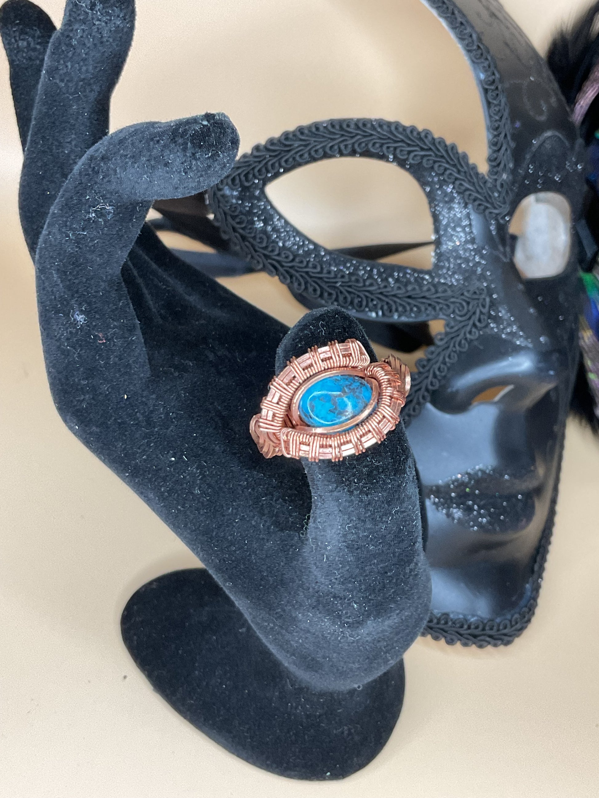 Introducing Harley, a luxurious Shattuckite ring in copper. With its intricate design and stunning blue stone, this piece is a true work of art. Elevate your style and make a statement with this exclusive ring.