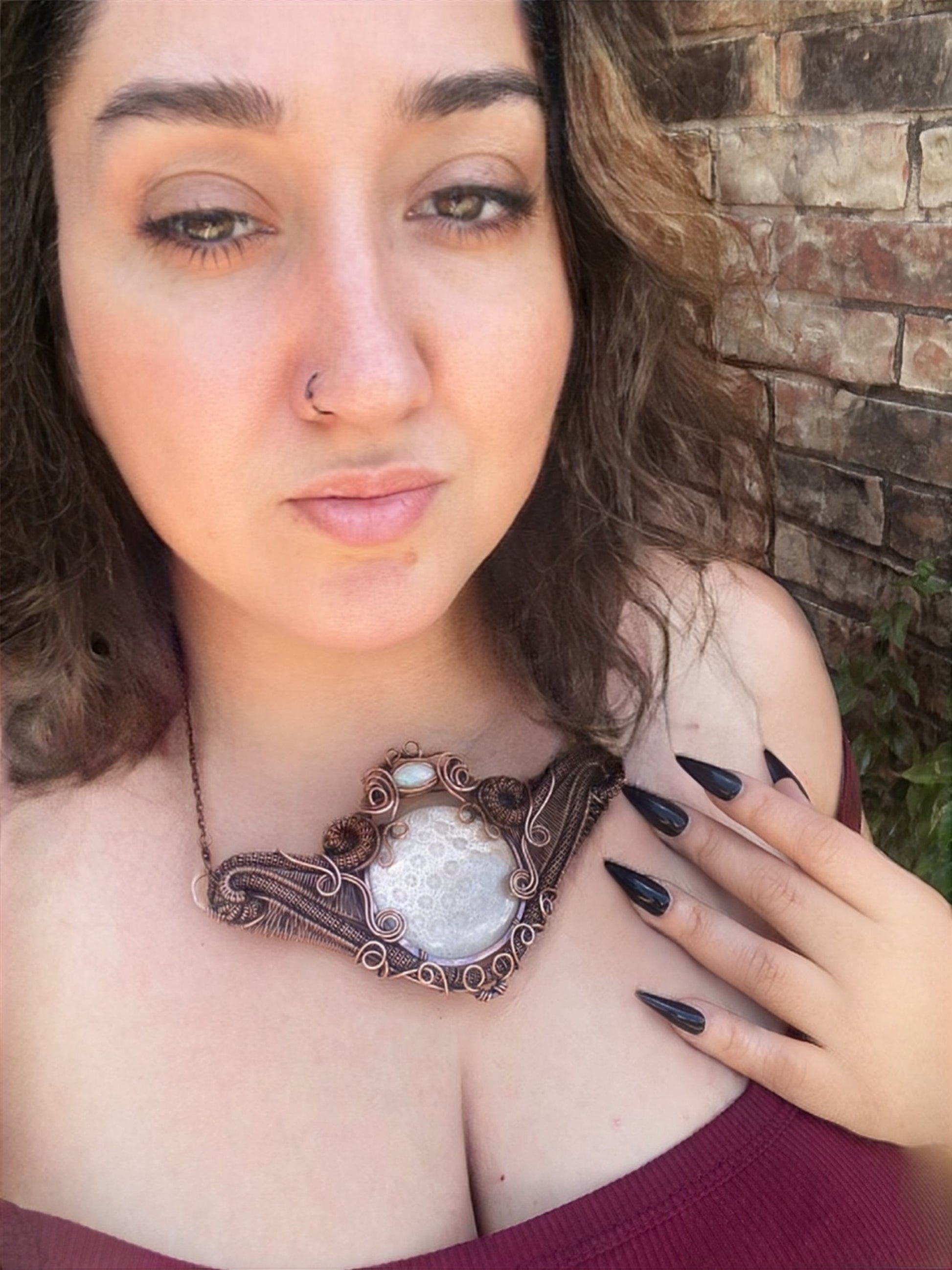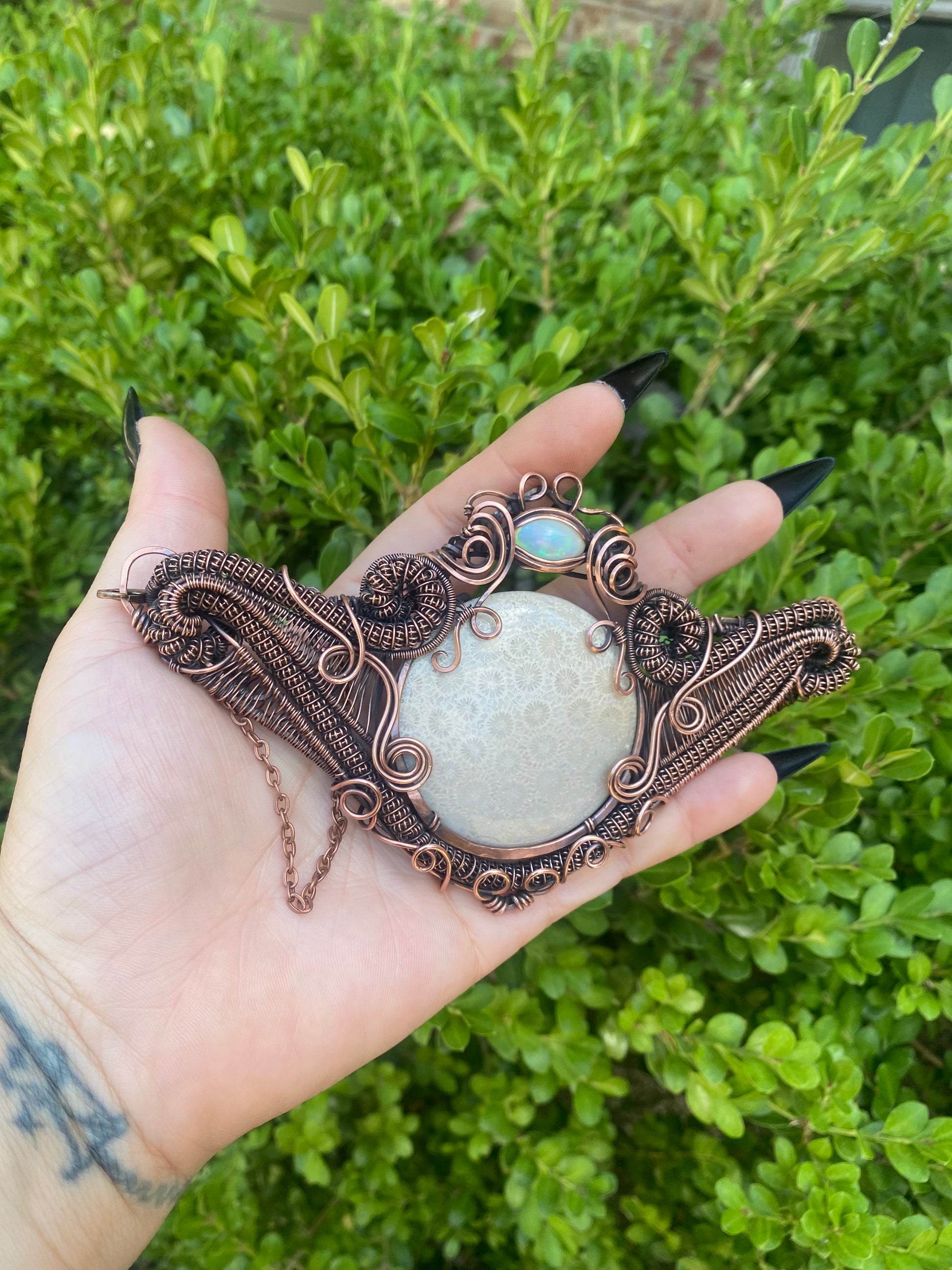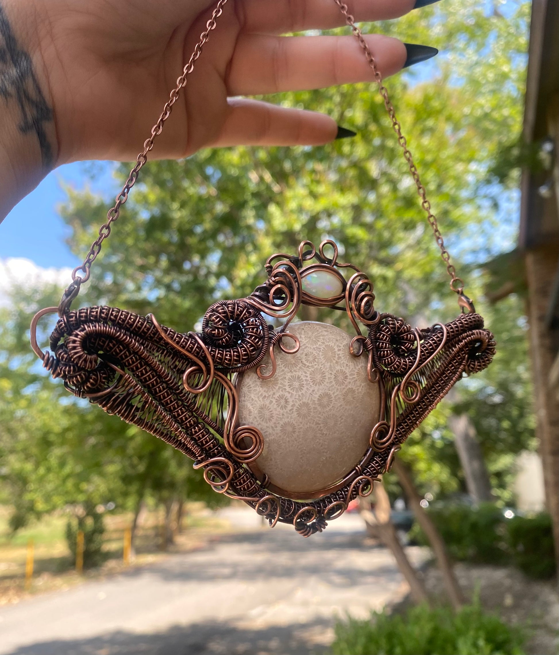 Experience the natural beauty of our Coral Fossil and Opal Copper Necklace. The stunning center stone and accent provide a unique and eye-catching look. The copper material adds a touch of warmth and elegance to any outfit. A must-have for those who appreciate nature's treasures.